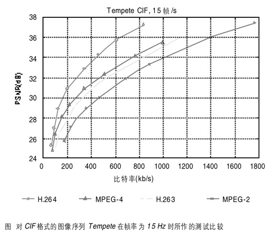 為了闡述H.264的編碼效率,我們將其與其它標(biāo)準(zhǔn)如MPEG-2、H.263、MPEG-4等作比較。使用QCIF、CIF格式的圖像序列作測(cè)試,所有編碼器都使用拉格朗日優(yōu)化技術(shù)。我們使用H.264的測(cè)試軟件JM2.0并使用了Main Profile的主要技術(shù)特征。對(duì)H.263和H.264采用的參考幀數(shù)為5,只編碼圖像序列的第一幀為I幀,每2個(gè)參考幀P之間插入2個(gè)非參考幀B。使用全搜索方式進(jìn)行32×32整數(shù)范圍的運(yùn)動(dòng)估計(jì),且由預(yù)先設(shè)定的量化參數(shù)來進(jìn)行比特率的調(diào)整。圖為對(duì)CIF格式的圖像序列Tempete在幀率為15Hz時(shí)所作的測(cè)試比較。