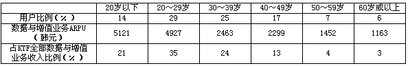 表4 KTF各年齡用戶群數(shù)據(jù)與增值業(yè)務消費能力對比(2004年1~9月)