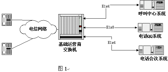 一種方式為固定分配, 即為每種語(yǔ)音系統(tǒng)分配固定數(shù)量的E1中繼,如圖1所示,這種方式的問題主要有兩個(gè)方面:一是中繼資源沒有充分共享使用,比如在晚上,可能電話QQ業(yè)務(wù)量很大而呼叫中心很小,而白天卻正好相反。如果為每一種業(yè)務(wù)都留有很大的中繼富裕又勢(shì)必導(dǎo)致中繼資源的浪費(fèi);二是當(dāng)中繼線路來源于多個(gè)運(yùn)營(yíng)商時(shí)存在連接上的困難。
