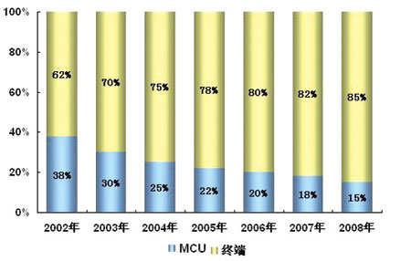 一般來說,終端和MCU是視頻會議系統(tǒng)產(chǎn)品最為關(guān)鍵的部分。計世資訊(CCW Research)的研究表明:近年來,終端的銷售比例持續(xù)增長,而MCU的銷售比例則相應(yīng)萎縮。2005年,終端和MCU的比例分別為78.0%和22.0%。