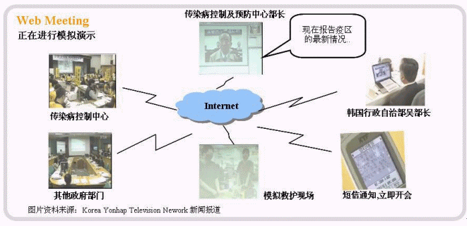 在韓國已經(jīng)安排多次的模擬演示,當(dāng)疫情在韓國發(fā)生及蔓延時,由韓國傳染病控制及預(yù)防中心發(fā)出開會通知,召集其他緊急醫(yī)療機構(gòu)、專家及政府部門(如行政自治部)等,一起進行視像會議。在會議上,傳染病控制中心將各地收集回來的最新情況及報表共享給參會人及團體。由各專家一起分析現(xiàn)況,進行討論、判斷及決定解決辦法及措施。同時要求其他政府部門協(xié)調(diào)與全力幫助,目的是將疫情在最短的時間及在最少的范圍內(nèi)得到控制及處理,減少對人民生命安全及國家損失的影響。先進的通訊科技能加快對危機發(fā)生時,政府相關(guān)部門及機構(gòu)對事件的了解、分析、處理及決策,準(zhǔn)確傳達信息、加強信息的交流、提高辦事效率、加快決策速度以及落實措施及處理方法的執(zhí)行。最重要的事,將各方面的損失降到最低的程度,避免了事情的惡化及波及其他范圍的負(fù)面影響。