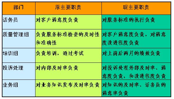 首先,要根據(jù)組織的目標來確定我們需要哪些流程,即需要哪些流程才能保證組織目標的實現(xiàn);其次,根據(jù)流程的需要,即為了保證流程的有效運行,來劃分不同部分的職責;最后,根據(jù)各部分職責的劃分來設置組織的架構。如我們根據(jù)客服中心流程運行的需要,對組織架構和相關班組的主要職責進行了調(diào)整,以保證流程的有效順暢運行。如部分班組的主要職責調(diào)整如下: