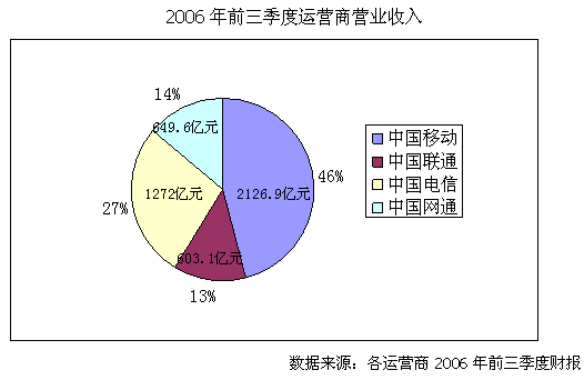 近日,四大運(yùn)營商紛紛公布2006年前三季度的財(cái)務(wù)報(bào)表,截止9月底中國移動(dòng)營運(yùn)收入達(dá)到2126.91億元,比上年同期增長20.8%,遠(yuǎn)遠(yuǎn)高于競爭對(duì)手中國聯(lián)通的營業(yè)收入增長5.6%,而固網(wǎng)運(yùn)營商中國電信和中國網(wǎng)通的收入增長更低,僅為4.5%和2.03%。透過這些數(shù)字,我們看到的是運(yùn)營商實(shí)力差距的進(jìn)一步拉大。