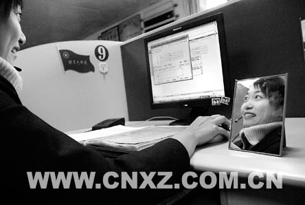 12319服務(wù)熱線中心有13個(gè)工作臺(tái),每個(gè)工作臺(tái)前都有一面鏡子。該中心的負(fù)責(zé)同志說,這面鏡子是檢驗(yàn)工作人員是否微笑服務(wù)的“晴雨表”。鏡子是今年初安裝的,大家還給它起了一個(gè)響亮的名字:“微笑鏡”。
