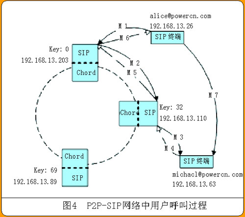 IP地址為192.168.13.26的用戶alice@powercn.com要呼叫用戶michael@powercn.com。alice可以把請求發(fā)給P2P-SIP網絡中任一PN。考慮到要在P2P-SIP網絡上提供增值業(yè)務(比如計費),alice把INVITE請求發(fā)給管理它的PN更合適一點,在本例中是IP為192.168.13.203,Key值為0的PN。如圖4中M1所示。