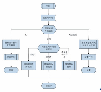 多媒體彩鈴用戶可以為某一位或某一組主叫用戶設(shè)定不同的視頻,當(dāng)某個主叫用戶來電時,系統(tǒng)根據(jù)被叫用戶的狀態(tài)和主叫所屬的群組播放不同的視頻。如果被叫忙或者無法接通,則播放能表達(dá)被叫當(dāng)前狀態(tài)的默認(rèn)系統(tǒng)視頻;如果被叫空閑,則根據(jù)主叫號碼所屬的群組播放被叫為該群組定制的視頻。無論在哪種情況下,主叫都可以在手機上欣賞到精彩的視頻媒體。圖1是多媒體彩鈴業(yè)務(wù)使用流程。
