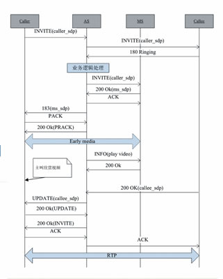 Session Progress 響應(yīng),從而在主叫和MS之間建立早期媒體流。AS向MS發(fā)送指示播放視頻的INFO消息,MS直接向主叫播放定制的精彩視頻。當(dāng)被叫摘機后,AS收到帶被叫SDP的200