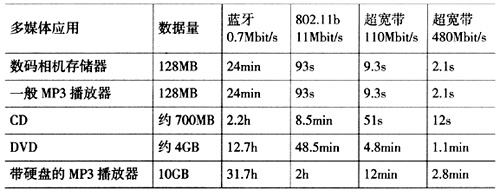 2.0接口相當(dāng),遠(yuǎn)遠(yuǎn)高于無(wú)線局域網(wǎng)802.11b的11 Mbit/s,也比下一代無(wú)線局域網(wǎng)802.11a/g的54 Mbit/s高出近一個(gè)數(shù)量級(jí)。UWB通信的功耗較低,能更好地滿(mǎn)足使用電池的移動(dòng)設(shè)備的要求。另外,UWB信號(hào)的功率譜密度非常低,信號(hào)難以被檢測(cè)到,再加上采用的跳頻、直接序列擴(kuò)頻等擴(kuò)頻多址技術(shù),使非授權(quán)者很難截獲傳輸?shù)男畔,因而安全性非常好。?是一些典型的實(shí)時(shí)多媒體應(yīng)用對(duì)不同無(wú)線傳輸技術(shù)的數(shù)據(jù)傳輸速率的要求。從表中可以看出,如果采用無(wú)線的方式來(lái)進(jìn)行傳輸,只有UWB技術(shù)可以滿(mǎn)足各種應(yīng)用的要求。