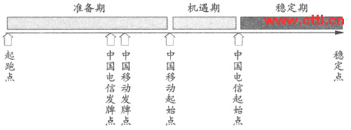 此版本是表示中國移動(dòng)進(jìn)入3G業(yè)務(wù)運(yùn)營早于競(jìng)爭對(duì)手。圖4根據(jù)中國移動(dòng)和中國電信發(fā)放牌照的不同時(shí)期而將全業(yè)務(wù)運(yùn)營市場(chǎng)策略劃分成準(zhǔn)備期、機(jī)遇期和穩(wěn)定期。