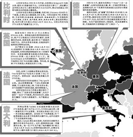 對于歐洲觀眾來說,IPTV(網(wǎng)絡(luò)付費電視)就是他們未來的生活主畫面之一。他們只需每月交付30歐元(約合人民幣309元)到60歐元(約合人民幣618元)的費用,便可在電視或電腦上選擇收看上百個頻道的電視節(jié)目。歐洲雖然缺乏強大的衛(wèi)星網(wǎng)絡(luò)作為技術(shù)支持,不過卻擁有多家實力雄厚的電信營運商,這些巨頭們擁有相同的興趣和市場,正考慮是否聯(lián)合經(jīng)營,共同分食歐洲網(wǎng)絡(luò)電話電視市場這塊“大蛋糕”。