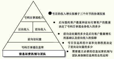 從商業(yè)模式的內(nèi)涵來分析,號碼百事通的盈利模式與市場上主流的網(wǎng)絡(luò)搜索公司的盈利模式相似,都實現(xiàn)了通過向后向商家出售推薦權(quán)進行盈利的模式。但是,從客戶價值和運營模式的角度,號碼百事通與搜索公司存在著本質(zhì)的不同: