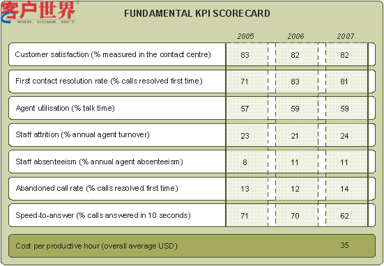 一次問(wèn)題解決率的記分已經(jīng)作為定義和測(cè)量標(biāo)準(zhǔn)擁有了更高的協(xié)調(diào)性,但是人工座席利用率,生產(chǎn)力的代名詞,應(yīng)該受到更多的關(guān)注,因?yàn)樗呛侠硪?guī)劃和管理資源的一個(gè)重要體現(xiàn)。員工離職率測(cè)評(píng)的是平均年流失率,是檢測(cè)人力資源管理效率的一項(xiàng)重要指標(biāo)。除了像處理今年24%的流失率所付出的高成本和努力外,客戶服務(wù)的間接成本也是值得注意的。員工曠工對(duì)企業(yè)來(lái)說(shuō)是無(wú)法計(jì)算的損失。注重激情,提高滿意度和激發(fā)員工的主動(dòng)性是解決這項(xiàng)問(wèn)題的關(guān)鍵點(diǎn)。電話放棄率統(tǒng)計(jì)顯示有十分之一的來(lái)電者會(huì)放棄再次來(lái)電,因此呼叫中心要滿足客戶的期望還有很長(zhǎng)的路要走。接聽(tīng)速度的記分統(tǒng)計(jì)中10秒的接聽(tīng)記錄有所下降,但是20秒的接聽(tīng)標(biāo)準(zhǔn)有整體的提高。生產(chǎn)小時(shí)成本是計(jì)算提供特定服務(wù)實(shí)際成本的標(biāo)準(zhǔn)尺度,同時(shí)也是了解呼叫中心每個(gè)生產(chǎn)小時(shí)所需的投資成本的重要依據(jù)。