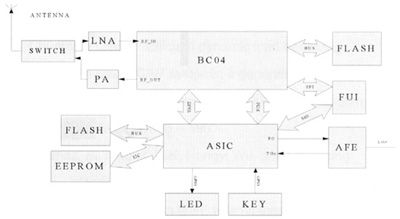 其中,BC04支持最大4個活動連接(包括耳機),同時支持兩路SCO語音,所以語音通過PCM和ASIC PCM相接可以有多路被送到模擬端,從而實現3方通話。ASIC部分實現PCM語音數據與模擬語音信號的相互轉換,通過發(fā)送和接收PSTN信令,負責對人機界面的控制。它通過GPIO(General