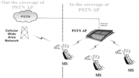 如圖3所示,使用藍牙CTP MS(mobile station)和PSTN AP,通過本地交換機與固網相連。其中,MS為雙模終端,可以根據不同網絡的資費差異預先設置采用何種網絡接打電話。在藍牙覆蓋范圍內,根據設置,CTP
