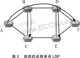 ....用圖2所示的6節(jié)點(diǎn)光網(wǎng)絡(luò)來闡述整個(gè)組播信令流程。與IP組播不同,點(diǎn)到多點(diǎn)LSP并不需要額外的組播組管理協(xié)議。這是因?yàn)槿~子節(jié)點(diǎn)的地址直接被包括在請(qǐng)求中,而不像IP組播中僅僅只是使用一個(gè)D類地址。所有的組播樹請(qǐng)求都將用一個(gè)三元組來表示{T,a,L},其中T是組播樹的標(biāo)識(shí)符,s是源節(jié)點(diǎn),L是組播樹的葉子集合。當(dāng)T等于O的時(shí)候意味著這是一個(gè)組播樹建立請(qǐng)求。例如,源節(jié)點(diǎn)A希望建立一個(gè)到葉子E和F的組播樹,那么這個(gè)請(qǐng)求就被表示為{0,A,{E,F(xiàn)}}。當(dāng)這顆樹被建立后,它將被分配一個(gè)全局唯一的標(biāo)識(shí)符,比如1。請(qǐng)求{1,A,{C1}}和{1,A,{F}}則分別意味著將葉子C嫁接到組播樹1和將葉子F從組播樹1中剪除。如果想刪除整棵樹,只需要將組播樹1的所有葉子都剪除即可,即{1,A,{C,E}}。