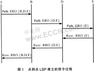 Switching Path)建立的信令過程。當(dāng)入口標(biāo)記交換路由器(LSR:Label Switching Router)A接收到一個(gè)業(yè)務(wù)請(qǐng)求后,它根據(jù)路由控制模塊計(jì)算出來的路由填寫顯示路由對(duì)象(ERO:Explicit