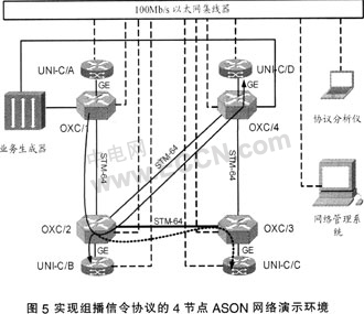 ....圖5顯示了一個(gè)用來實(shí)現(xiàn)組播信令協(xié)議的4節(jié)點(diǎn)ASON網(wǎng)絡(luò)演示環(huán)境。圖中OXC的核心交換矩陣是基于時(shí)分交換,交換粒度為一個(gè)SDH