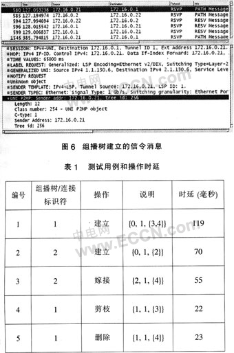 1出發(fā)的組播樹和單播連接,結(jié)果如表1所列。圖6顯示了Ethereal捕獲的組播樹建立的信令消息。在解開的Path消息中,可以發(fā)現(xiàn)經(jīng)過擴(kuò)展的UNI組播對(duì)象。然后,對(duì)已存在的連接進(jìn)行了動(dòng)態(tài)的修改。在第三個(gè)測例中,一個(gè)葉子被添加到單播連接上并使其變?yōu)橐豢媒M播樹。在嫁接和剪枝的操作中,業(yè)務(wù)生成器在已建立的連接上沒有觀察到丟包的現(xiàn)象。