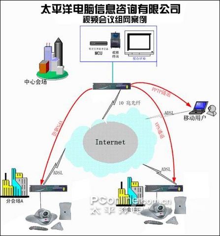 該方案有很強的針對性,作為主會場必須用10兆/20兆光纖接入INTERNET,且需要視頻交換處理設備MCU,而太平洋電腦網(wǎng)本身就具備雄厚的服務器作為基礎。廣州總公司還需要較高配置的視頻終端設備,在局域網(wǎng)網(wǎng)關上安裝較高配置路由器,主會場可以通過設置MCU隨時使某一分會場成為主席。