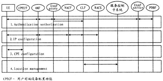 AMF負責翻譯UE的接入請求,將UE的IP地址分配請求以及網(wǎng)絡配置參數(shù)請求轉發(fā)至NACF,將用戶鑒權請求轉發(fā)給用戶接入鑒權功能(UAAF),反向則將來自NACF或UAAF的響應轉發(fā)給UE。