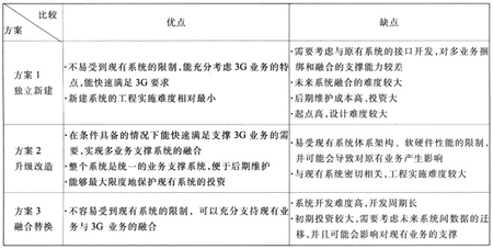 由于國(guó)內(nèi)電信運(yùn)營(yíng)商一般已建有業(yè)務(wù)支撐系統(tǒng),因此在進(jìn)入到3G時(shí)代后就面臨著如何選擇3G融合計(jì)費(fèi)系統(tǒng)建設(shè)方式的問題。3G融合計(jì)費(fèi)系統(tǒng)的建設(shè)方案主要有獨(dú)立新建、升級(jí)改造、融合替換三種。三種不同的建設(shè)方案對(duì)比分析見表2。