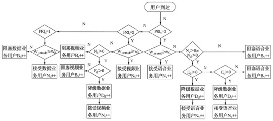 1)用戶到達(dá)事件。當(dāng)帶寬資源充裕時,各類用戶到達(dá)不論優(yōu)先級高低,均可按需分配得到帶寬。當(dāng)帶寬資源不能滿足接入需求帶寬時,則按照優(yōu)先級順序從低到高對已接入的用戶進(jìn)行QoS降級服務(wù)(降一級或若干級),直到能夠騰出足夠的帶寬滿足新用戶的需求,否則阻塞該用戶,具體流程如圖2所示。