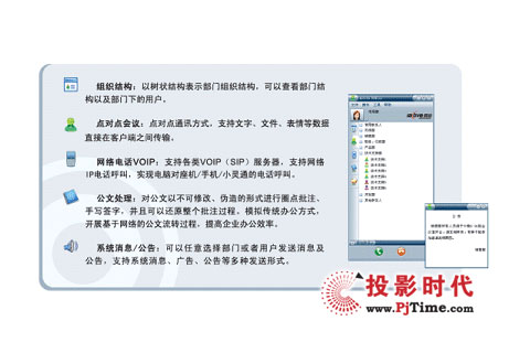 Center運(yùn)營架構(gòu)為基礎(chǔ),有效整合了企業(yè)的如電話、傳真、手機(jī)、短信、E-mail、即時(shí)通訊等各種常用的通信設(shè)備和媒體應(yīng)用,并進(jìn)行統(tǒng)一管理、計(jì)劃及協(xié)同,是一套集即時(shí)通訊、網(wǎng)絡(luò)電話、點(diǎn)對(duì)點(diǎn)會(huì)議、多方視頻會(huì)議、遠(yuǎn)程教學(xué)、遠(yuǎn)程監(jiān)控、組織結(jié)構(gòu)等為一體的桌面融合辦公系統(tǒng),能夠全面滿足企業(yè)遠(yuǎn)程的日常交流、會(huì)議培訓(xùn)、協(xié)同辦公、商務(wù)談判、指揮調(diào)度、安全保衛(wèi)等各種需求。