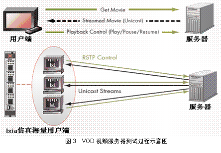 Media Server等業(yè)界常見的視頻服務(wù)器互通并提供性能測試。圖3是VOD服務(wù)器交換過程與IXIA進行性能測試示意。