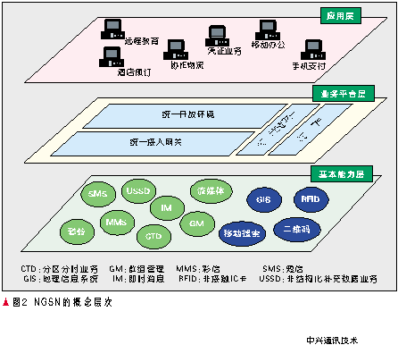 NGSN是為了適應(yīng)網(wǎng)絡(luò)和技術(shù)的融合趨勢、運營商轉(zhuǎn)型的需求提出的,通過整合各種網(wǎng)絡(luò)業(yè)務(wù)能力,實現(xiàn)數(shù)據(jù)、業(yè)務(wù)、能力和管理的統(tǒng)一,從而能夠快速提供各種增值業(yè)務(wù)、協(xié)助運營商在價值鏈中處于主導(dǎo)地位。其概念層次如圖2所示。