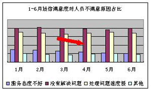 客服代表的工作情緒及客戶滿意度呈現(xiàn)上升趨勢:3-6月的短信滿意度穩(wěn)步提升(見下圖1),6月短信滿意度較3月提升1.25個百分點,短信滿意度調(diào)查中“非常滿意”項占比自4月份開上升1.42個百分點(見下圖2)。從客戶不滿意原因情況看,由于人員導致客戶不滿意的比例下降0.6%(見下圖3);對導致人員不滿意的原因分析可知,話務員服務態(tài)度不好的占比有明顯的下降(見下圖4)。