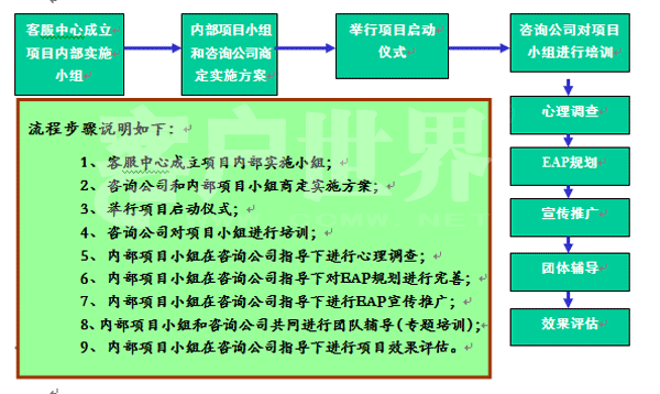 中心采用“內(nèi)部為主,內(nèi)外結(jié)合”的方式,在中心選取符合EAP項(xiàng)目實(shí)施基本知識技能要求的人員組建內(nèi)部EAP去專業(yè)化應(yīng)用團(tuán)隊(duì),由咨詢公司負(fù)責(zé)培養(yǎng)客服中心內(nèi)部EAP團(tuán)隊(duì)人員。內(nèi)部項(xiàng)目小組在咨詢公司指導(dǎo)下開展心理調(diào)查、規(guī)劃完善、宣傳推廣、團(tuán)隊(duì)輔導(dǎo)、效果評估等一系列活動。