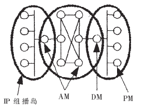 在采用混合式組播的IP視頻會(huì)議中,與會(huì)成員組成如圖1所示的拓?fù)浣Y(jié)構(gòu)。在每個(gè)IP組播島內(nèi),與會(huì)成員之間的數(shù)據(jù)傳輸使用IP組播,并選定一個(gè)與會(huì)成員作指定成員(Designate Member,DM),把島內(nèi)除DM外的與會(huì)成員稱(chēng)為其他成員(Pertinent Member,PM),DM是島內(nèi)成員與島外成員之間通信的橋梁。島外成員與DM參加應(yīng)用層組播疊加網(wǎng)[5](包括一個(gè)控制拓?fù)浜鸵粋(gè)數(shù)據(jù)拓?fù)?的構(gòu)建,將其稱(chēng)為應(yīng)用層組播成員(ALM Member,AM),AM之間的數(shù)據(jù)傳輸使用應(yīng)用層組播。IP組播島中PM通過(guò)DM與疊加網(wǎng)相連,DM與島外成員之間的數(shù)據(jù)傳輸采用應(yīng)用層組播方式,與島內(nèi)的成員之間的數(shù)據(jù)傳輸使用IP組播的方式。DM負(fù)責(zé)將來(lái)自疊加網(wǎng)的數(shù)據(jù)以IP組播方式傳送給組播島中PM,PM的數(shù)據(jù)也通過(guò)IP組播方式傳送到DM,由DM以應(yīng)用層組播的方式發(fā)送給疊加網(wǎng)上的其他與會(huì)成員。