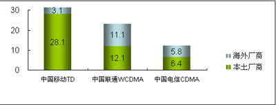 在3G設(shè)備市場(chǎng)方面,2008年,中國(guó)的WCDMA、CDMA2000與TD-SCDMA三種3G網(wǎng)絡(luò)在建設(shè)上有不同的進(jìn)展。中國(guó)移動(dòng)啟動(dòng)了第二階段的TD-SCDMA網(wǎng)絡(luò)建設(shè)、中國(guó)電信啟動(dòng)了涉及面向81個(gè)重點(diǎn)城市的CDMA全網(wǎng)招標(biāo)、而中國(guó)聯(lián)通也開(kāi)始7個(gè)城市建立WCDMA試驗(yàn)網(wǎng)絡(luò)的建設(shè)工作。而在所有的網(wǎng)絡(luò)建設(shè)中,中國(guó)本土廠商借3G契機(jī)迅速提升競(jìng)爭(zhēng)力,占據(jù)了3G網(wǎng)絡(luò)建設(shè)大部分市場(chǎng)份額。