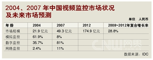 IDC的數(shù)字同樣樂觀。跟據(jù)IDC在2008年的預(yù)測(cè),2008~2012年,中國(guó)視頻監(jiān)控市場(chǎng)的年均復(fù)合增長(zhǎng)率將達(dá)28.8%,遠(yuǎn)高于IT市場(chǎng)投入的平均增長(zhǎng)率。而在模擬、數(shù)字與IP模式(即網(wǎng)絡(luò)監(jiān)控)組成的視頻監(jiān)控市場(chǎng)里,IP的增長(zhǎng)率又將高于前二者,成為市場(chǎng)增長(zhǎng)的強(qiáng)勁動(dòng)力!保ㄗⅲ耗M監(jiān)控是指圖像信號(hào)在采集后,通過模擬信號(hào)傳輸?shù)姆忾]式視頻監(jiān)控系統(tǒng)模式;數(shù)字監(jiān)控是指圖像信號(hào)在采集后,經(jīng)過編碼轉(zhuǎn)化成數(shù)字信號(hào)再進(jìn)行傳輸?shù)姆忾]或半封閉式視頻監(jiān)控系統(tǒng)模式;網(wǎng)絡(luò)監(jiān)控是指系統(tǒng)建立在以網(wǎng)絡(luò)為基礎(chǔ)的傳輸平臺(tái)的開放式視頻監(jiān)控系統(tǒng)模式)。