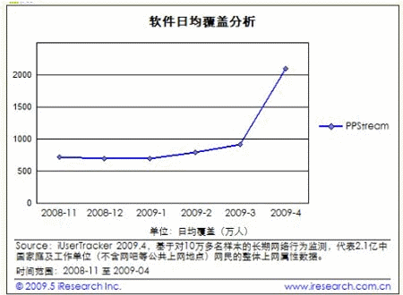 近日,艾瑞四月P2P流媒體數(shù)據(jù)出爐,PPS繼三月登頂后再次衛(wèi)冕成功。然而與三月相比較,PPS在短短一個(gè)月內(nèi)日均覆蓋人數(shù)從910.8萬(wàn)人暴漲至2093.3萬(wàn)人,令人乍舌的“驚變”引起了業(yè)內(nèi)人士甚至廣告主的密切關(guān)注。