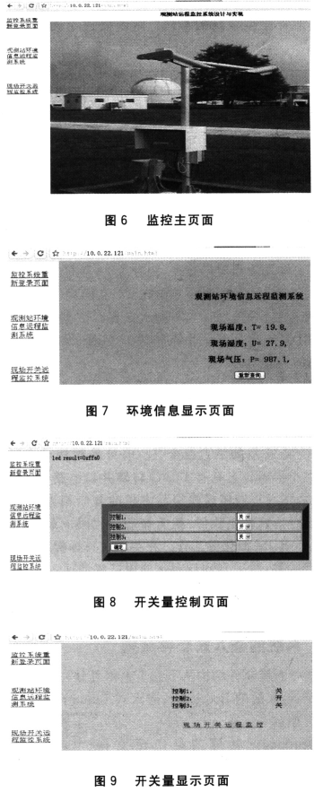 該監(jiān)控主頁(yè)面左側(cè)顯示有3個(gè)模塊:重新登陸頁(yè)面;觀測(cè)站遠(yuǎn)程環(huán)境信息檢測(cè)系統(tǒng),能方便實(shí)時(shí)地查詢現(xiàn)場(chǎng)的環(huán)境狀態(tài),如圖7所示;現(xiàn)場(chǎng)開關(guān)的遠(yuǎn)程監(jiān)控系統(tǒng),可以控制3個(gè)開關(guān)量的開關(guān),如圖8所示,并能查詢它們當(dāng)前狀態(tài),設(shè)置監(jiān)控頁(yè)面每隔15