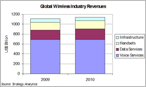 2009年,無線數(shù)據(jù)業(yè)務(wù)收入比上年增長(zhǎng)了9.5%,支撐了行業(yè)總收入沒有下滑。Strategy Analytics預(yù)測(cè)2010年無線數(shù)據(jù)業(yè)務(wù)收入將增長(zhǎng)13%,市場(chǎng)整體規(guī)模將超過2000億美元。