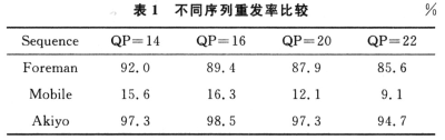 為了更全面評價本算法的性能,對不同測試序列在同樣丟包率情況下對本章的機制進行性能測試。考慮到影響本章算法性能的包括序列的紋理復雜程度以及運動劇烈程度。這里利用運動較為劇烈但紋理相對較單一的Foreman序列,紋理復雜程度較高的Mobile以及運動程度較低的Akiyo序列作為評測序列。表1是對這三個測試序列在QP=14,16,20,22,丟包率為3%的情況下前100幀做的統(tǒng)計,其中出錯Slice個數(shù)為24,則出錯宏塊總數(shù)為24×11=264。令NMB=264,則根據模式判決結果,即可得到對重發(fā)率的統(tǒng)計。