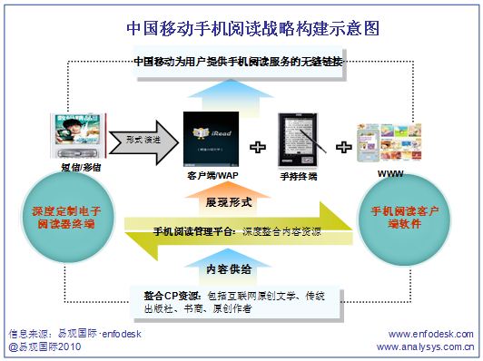 易觀國(guó)際(Analysys International)分析認(rèn)為,中國(guó)移動(dòng)發(fā)展手機(jī)閱讀的整體思路是基于渠道資源,縱貫內(nèi)容、終端以強(qiáng)勢(shì)整合手機(jī)閱讀的產(chǎn)業(yè)鏈。將原有的手機(jī)閱讀的短信/彩信形式演變?yōu)榭蛻舳塑浖?WAP、手持終端、WWW的形式,最終為用戶提供手機(jī)閱讀的無(wú)縫鏈接體驗(yàn)。