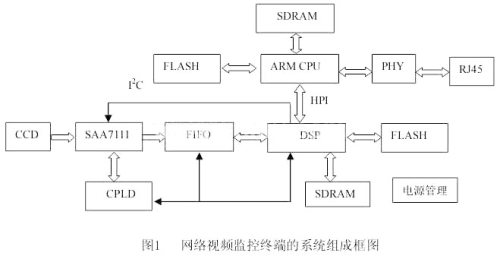 為實現(xiàn)視頻實時檢測以及網(wǎng)絡(luò)傳輸功能,本監(jiān)控終端采用ARM+DSP的體系框架,系統(tǒng)組成如圖1所示,主要包括以ARM S3C4510B為核心的主控兼網(wǎng)絡(luò)傳輸模塊,以SAA7111為核心的視頻采集模塊,以DSP