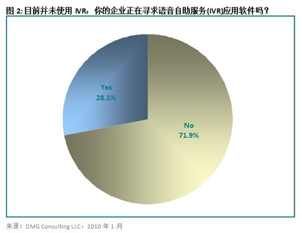 28.1%目前還沒有使用IVR系統(tǒng)的公司正在積極尋求語音自助服務解決方案來幫助自己達成目標,這一數(shù)字高得頗讓人驚訝。見圖2。經(jīng)濟衰退促使那些曾經(jīng)對使用自助服務技術猶豫不決的企業(yè)下定決心投資購買此類解決方案。一個具有正確規(guī)劃、設計和投放過程的IVR系統(tǒng)能夠將人工代理處理的電話量降低20%到90% (長期來說),具體數(shù)字有賴于聯(lián)絡中心的目的以及編入解決方案內部的任務。IVR用戶的增長勢頭有望在經(jīng)濟形勢好轉之后仍然延續(xù)下去。一個經(jīng)過良好設計并成功實施的IVR方案所帶來的利益和節(jié)約的成本是即便最不情愿使用它的經(jīng)理都不得不承認的。