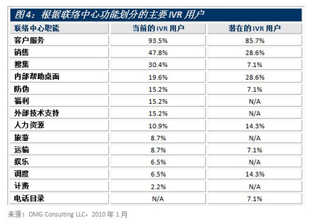 圖4根據(jù)職能對現(xiàn)有和潛在的主要IVR用戶進行了區(qū)分?蛻舴⻊蘸弯N售聯(lián)絡中心是最上層的IVR用戶,分別占現(xiàn)有用戶量的93.5%和47.8%,占潛在用戶量的85.7%和28.6%。