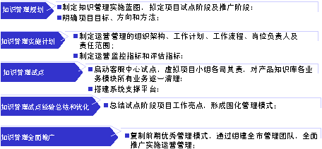 萬丈高樓平地起,本項目由客服中心總經(jīng)理牽頭,副總經(jīng)理和部門經(jīng)理組成領(lǐng)導(dǎo)小組,全面審視中心運(yùn)營管理現(xiàn)狀,探索“SECI知識循環(huán)管理”理論與實(shí)際工作結(jié)合點(diǎn),針對客服中心滿意度提升的三大主要癥結(jié)勾勒出知識管理實(shí)施藍(lán)圖,試點(diǎn)階段和推廣階段,總體目標(biāo)和階段性目標(biāo),監(jiān)控手段和評估指標(biāo)等。