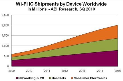 Wi-Fi技術現已被用于幾乎所有筆記本和上網本、智能電話和游戲設備。電話、音頻播放器、打印機、機頂盒以及其他消費類電子設備對Wi-Fi技術的采用率也在不斷增加,來自Wi-Fi聯盟和多家調研機構的數據印證了這種市場增長趨勢。2009年,僅在中國銷售的具備Wi-Fi功能的筆記本電腦就達到800萬臺,全球Wi-Fi設備認證數量則增加了約50%,消費類電子設備和電話數量增加了100%以上。截止到2010年7月,消費類電子設施與電話類產品的認證數量已經超過了2009年全年數量,預計全年售出約8億臺Wi-Fi設備。