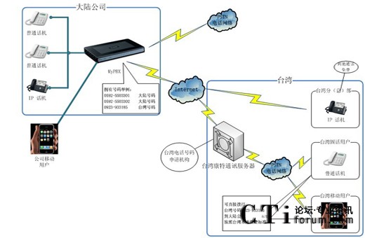 “兩岸通”利用最新的VOIP技術(shù),實(shí)現(xiàn)大陸固話辦公電話系統(tǒng)通過(guò)互聯(lián)網(wǎng)遠(yuǎn)程連接到臺(tái)灣的電話系統(tǒng),實(shí)現(xiàn)兩岸低資費(fèi)甚至零資費(fèi)電話互打。