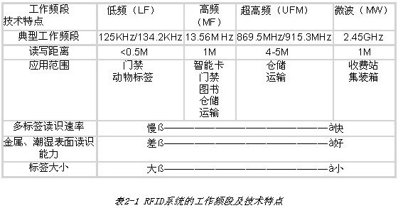 RFID系統(tǒng)的工作頻段可以為低頻(LF)(30-300kHz,典型頻率有125 kHz,134.2 kHz)、高頻(HF)(3-30MHz,典型頻率為13.56M Hz)、超高頻(UHF)(300-968MHz,典型頻率869.6MHz、915.3MHz)、微波(MW)(2.45-5.8GHz,典型頻率為2.45GHz)等四個(gè)頻段,具體的頻點(diǎn)由各個(gè)國(guó)家或地區(qū)的無(wú)線電管理部門確定。根據(jù)不同的工作頻段,在無(wú)源的情況下,其技術(shù)特點(diǎn)和應(yīng)用范圍也不同,如下表所示: