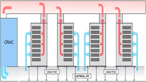 追求更低前期成本和更高運行效率的公司可以安裝被動式冷卻系統(tǒng)。它們的機殼上裝有一個氣密的后門和煙囪,用于收集來自服務氣的熱排風,并將其直接引導至CRAC裝置上的回風管道中。然后,CRAC裝置對排風進行冷卻并重新循環(huán)。被動式系統(tǒng)要求機柜從前到后都具有較強的氣密性,以便與由CRAC裝置進入的冷風混合的服務器熱風盡量少。通過比普通的熱-冷通道技術更徹底地分離冷風和熱風,設計合理的被動式冷卻系統(tǒng)甚至能以低成本使灼熱的30kW服務器機柜在安全溫度下運行。