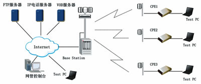 上文介紹的主要測試領(lǐng)域側(cè)重實(shí)驗(yàn)室環(huán)境,運(yùn)營商在對(duì)設(shè)備經(jīng)過一定程度上的實(shí)驗(yàn)室測試后,一般會(huì)進(jìn)一步進(jìn)行外場測試。在外場測試中,覆蓋、容量、多終端下的QoS保證、移動(dòng)性、長時(shí)傳輸能力等方面將成為重點(diǎn)的測試內(nèi)容,下面就針對(duì)固定WiMAX技術(shù),對(duì)其部分外場測試內(nèi)容進(jìn)行介紹(典型外場測試框圖參考圖3)。