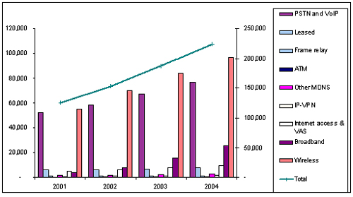 IDC亞太地區(qū)通信研究機構(gòu)的負責人Sandra Ng表示,在傳統(tǒng)數(shù)據(jù)業(yè)務市場包括租用電路、幀中繼、DDN、ATM、X.25以及ISDN,其中租用電路業(yè)務的收入依然占據(jù)了主導地位,隨后是DDN業(yè)務和幀中繼。2002年這一傳統(tǒng)數(shù)據(jù)業(yè)務市場的規(guī)模有望達到100億美元,增長百分之5。
