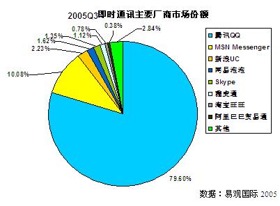 在現(xiàn)階段的中國即時通訊市場,三大廠商優(yōu)勢明顯。騰訊 QQ 以其最早進(jìn)入即時通訊市場、商業(yè)模式創(chuàng)新成功、用戶群龐大等各種因素所帶來的優(yōu)勢仍舊延續(xù)著對即時通訊市場的幾乎壟斷式的占有,市場份額高達(dá)79.6%。緊隨其后的